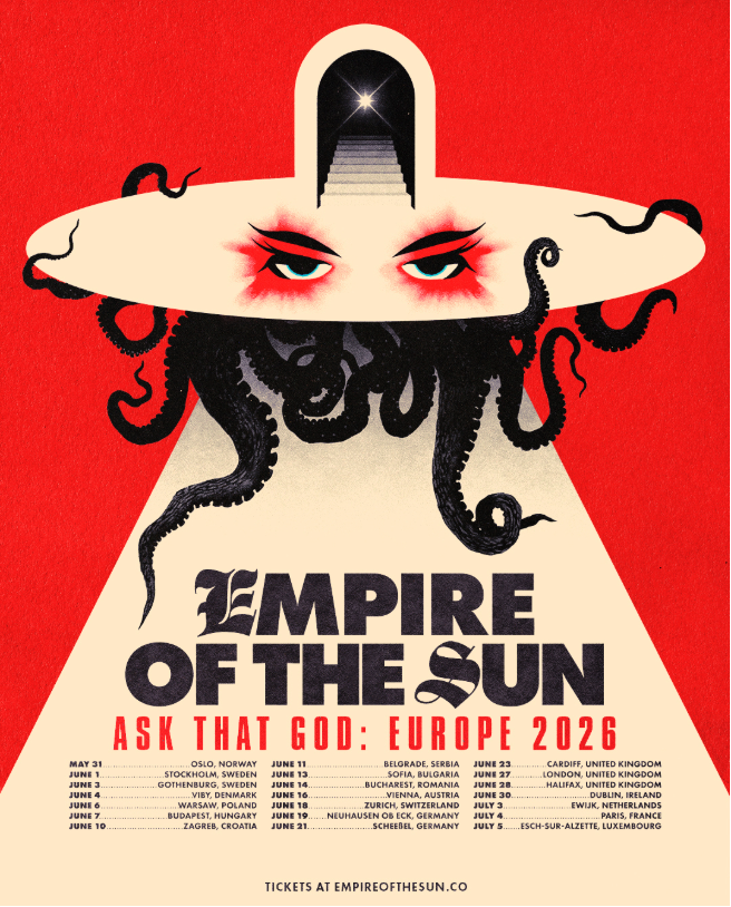 Trupa australiană de muzică electronică Empire of the Sun revine în Europa și Marea Britanie începând din luna mai, cu peste 20 de concerte incluse în turneul Ask That God Tour 2026. Duo-ul va ajunge atât în țări deja vizitate în cadrul turneului european din 2025 – primele lor show-uri în regiune după o pauză de șase ani – cât și în destinații noi, precum Irlanda, Norvegia, Suedia, Austria sau Danemarca.